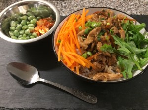 When the rice is cooked, fluff it up using a fork and then divide equally between 4 bowls. Lay the carrots around the left side of the bowl, the rocket leaves around the right side of the bowl and then fill the centre with the chicken, drizzling the teriyaki sauce over the chicken. Serve the broad beans and kimchi in a bowl on the side.
