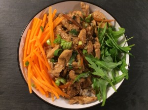 Heat the oil in a wok over a medium high heat. Cook the chicken breast strips in the wok until they are cooked through, stirring to stop it from sticking. Once cooked, add in the crushed garlic, the two soy sauces, the white wine and the sugar, stirring to dissolve. Leave the teriyaki sauce to boil down and reduce by half. When reduced by half, add in a handful of the spring onions and carrots and reduce by a third.
