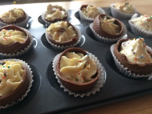Use a serrated knife to halve the Easter eggs as best as you can and place one in each cavity of a 12 hole bun tin. Keep any broken pieces that fall off in a small bowl and break them up into small pieces.
