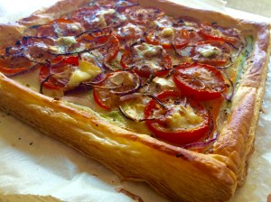 There’s no shame in using ready made puff pastry, especially when it’s so readily available, cheap and good quality from many supermarkets. The tart has flaky and delicate buttery puff pastry with a layer of smooth cream cheese and lots of good vegetables which are tasty and texturally all different; the cucumber provides a soft mellow base, the carrots add slight sweetness as well as a tiny amount of crunch, the tomato adds moisture and sweetness as it roasts on the surface and the red onions cook down and become crisp. The tart is finished off with melted brie and gorgonzola.