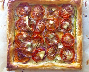 Arrange the cucumber and carrot ribbons over the pastry so that the cream cheese is concealed, again reaching up to the border. Place 16 tomato slices on the tart in a 4×4 grid as in the picture and scatter over the thinly sliced red onions and the brie and gorgonzola. Finish with a crack of black pepper and brush the top of the puff pastry with egg wash.