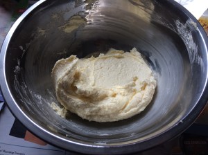 Sift in the plain flour and baking powder and using a rubber spatula, fold through the dry ingredients. Before the mixture comes together into dough, add in the rainbow sprinkles and continue to mix until a pliable dough forms.