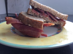 For me, the perfect bacon butty is toasted sliced white or wholemeal bloomer (I’m not fussed) spread with butter with crisp unsmoked bacon.