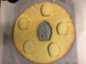Remove the base from a 10in loose bottomed fluted tart tin. Use the tart tin to cut out a disc of the linzer cookie dough. Slide the base of the tin under the cookie and move to the lined baking tray. Refrigerate for 15 minutes meanwhile repeat the same process to cut out a second disc. On one disc, use a large shaped cutter to remove some dough for the hole in the centre of the top cookie – this cookie can act as the base for one sandwich cookie! I like to take the centres from the Linzer Sandwich Cookies and place them on top to continue the theme.