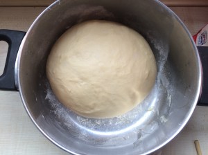 Turn out onto a lightly floured work surface and knead for about 5 minutes until it is smooth. Place back into the bowl and cover with clingfilm and allow to prove for 15 – 20 minutes.
