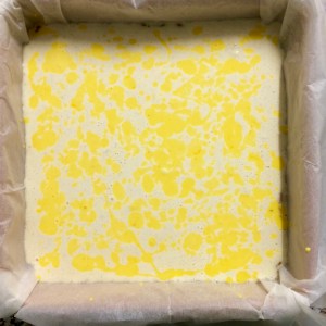 To add a decorative element, I remove some of the cheesecake mixture and add food colouring to it. This small amount of mixture requires just a single egg yolk. The addition of yellow colouring emphasises the egg yolk colour and helps to create an attractive design. The mixture is too fluid to swirl properly but it doesn’t bleed and run either, allowing you to create a random pattern on the surface.