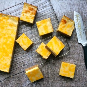 Bake the cheesecake for about 25 minutes or until the surface is lightly browned, golden at the edges and wobbles just slightly in the very centre. Leave the cheesecake to cool fully in the tin before slicing into 16 squares.