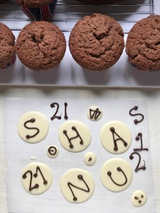 Next take the dark chocolate and pour into a piping bag. Cut off a small hole from the piping bag and pipe the letters/numbers you require. Slide onto the base of an upturned baking tin or onto a baking tray and refrigerate until fully set.