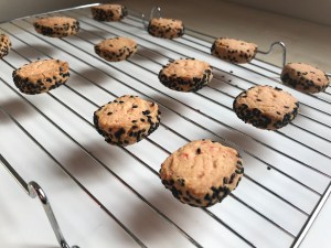 I really like the contrast of the colours of the pink cookies and the dark black sesame seeds. They also toast slightly during baking, adding a contrasting texture to the cookies with their crisp edges and soft centres, the trademark of a perfect cookie in my opinion.