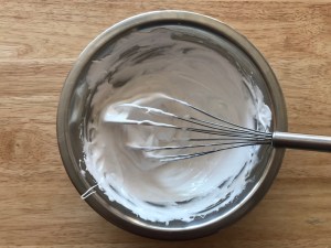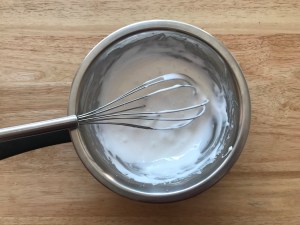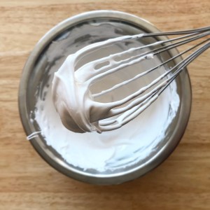With only 1 egg white, I whisk this by hand. I put the egg white and the sugar in a small metal bowl on top of a saucepan. I add enough boiling water so that it doesn’t touch the base of the bowl and begin to whisk. The steam from the water will heat up the egg white and dissolve the sugar. Constantly replacing the water will keep this heat going and for such a small quantity of egg white, it is ready in about 10 minutes whisked by hand. It will become thick, glossy and more opaque as the egg white cooks (at 61°C) and then further whisking will bring it to the right consistency. This is the same meringue that I made for my Dark Chocolate Teacakes with Marshmallow Meringue.