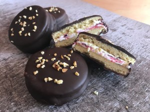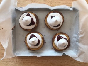 Turn the biscuit bases uncoated side facing up. Pipe some of the marshmallow meringue on to the biscuits, leaving a slight border. Add some of the jam and cover with a small amount of meringue. Place the top biscuit onto the bottom biscuit, ensuring you don’t push the meringue out. You can use your finger to tidy up the sides if needed. Place into the fridge for 30 minutes.