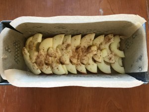 Meanwhile prepare the apples. De-core the apples and slice each apple in half. Cut half moons of the apple, about 2mm thick. Arrange the apples in 2 layers on the base of the loaf tin, firstly taking the largest apple slices and overlapping them in a single line down the centre of the tin and placing a second layer of apples on top, again overlapping this time in 2 lines. Sprinkle the apples with the sugar and cinnamon. You should have some spare apples; take 10 slices of apple and chop them into pieces and set aside.