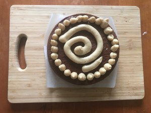 Place the final sponge on top, again with the bottom facing upwards. Spread a layer of the pastry cream on top, again leaving a 0.5cm border from the edge. Pipe 8 blobs of the pastry cream evenly spaced on top. Empty the remaining pastry cream back into the bowl and fill another piping bag with the rest of the pastry cream, this time cutting off a small hole to pipe fine dots in a circle on the surface.