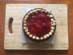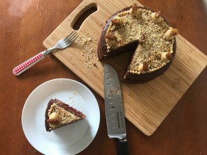 In a small bowl, mix the raspberry jam so that is looser and easier to spread. Give the pastry cream a mix and then transfer about three-quarters of it to a piping bag. Cut off a 1cm hole from the end. In a food processor, blitz the praline up into a fine crumb. Now you are ready to assemble the cake.