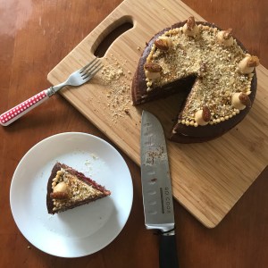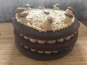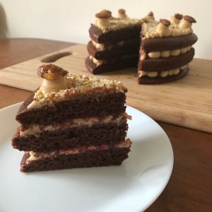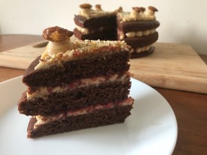 This week on Bake Off, the tent went all vegan with eggs, milk, butter, honey and meat thrown out of the tent. The signature was to make vegan savoury tartlets with two different fillings, the technical challenge was a tropical fruit pavlova made using aquafaba instead of egg whites and the showstopper was to make a celebration cake. For my first ever foray into vegan baking, I did my take on the showstopper! This is my Vegan Chocolate Praline Layer Cake with Peanut Butter Pastry Cream!!