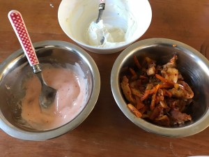 Meanwhile prepare the spreads. In one bowl, mix together the mayonnaise with the kimchi juice until it is an even pink-ish colour. In another bowl, beat the cream cheese until softened, adding the lemon juice and some salt and pepper to taste. Set both of the spreads aside.