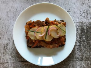 To assemble the kimchi pork smørrebrød, spread some kimchi mayo on 3 slices of the rye bread. Divide the kimchi pork between the 3 sandwiches. Arrange a straight line consisting of 5 slices of potato down the centre of the sandwich. Top with a few slices of the pickled red onion and thin julienne of spring onions.