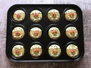 This week I decided to do the madeleines. But without a madeleine tin, I experimented by using a bun tin instead. Unfortunately these didn’t really work! However we learned from Kim-Joy this week that you shouldn’t give up during a bake if it’s not going according to plan. And even though my matcha madeleines didn’t go to plan, these Halloween-inspired Mini Matcha Cakes certainly did!