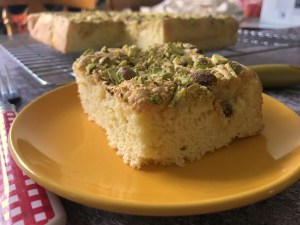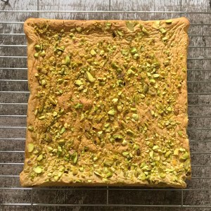 Transfer the cake batter to the tin and level out the batter as evenly as possible. Sprinkle over the crushed pistachios and bake the cake for around 15 – 18 minutes or until a skewer inserted into the very centre comes out clean. Hit the bottom of the tin while still warm; this can prevent the cake from shrinking too much.