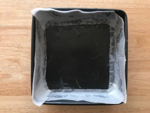 While doing the testing for this cake recipe, I found a way to really easily line the sides of the tin to get really tight corners. Grease the sides and base of a 20cm square tin. Cut strips of parchment which are slightly longer than 20cm and 1cm higher than the sides of the tin. Use a pair of scissors to cut small notches about 1cm along the long edge of the parchment. Place the squares on the base on the tin and line the sides with the rest of the parchment so it fits snugly. Repeat for all 4 sides and then cut out a square of parchment to line the base.