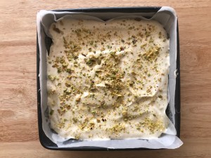 First prepare the baking tin as detailed above. Place the pistachios into a sandwich bag and use a rolling pin to bash them into small pieces with some larger chunks and some smaller pieces like dust. Set aside.
