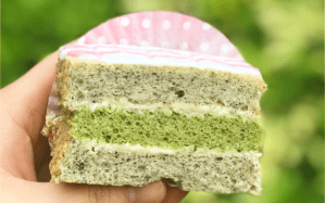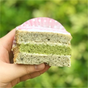 I use black sesame powder for the sponge which is essentially ground up toasted black sesame seeds. Black sesame has a smoky nutty bitter flavour to it and it can take a bit of getting used to and similarly, matcha has an earthiness that isn’t everyone’s cup of tea (pun intended). This makes these angel cake slices quite mature and adult in flavour, as well as modern! For the layers, I use two layers of black sesame sponge and a single layer of matcha sponge, which has a nice colour contrast.