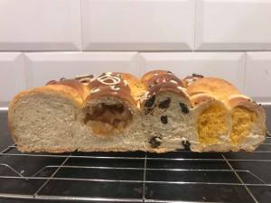 The hardest part of this recipe is filling and shaping the buns quickly. If you take too long filling the buns, then there might not be enough room to place all 20 of the buns inside the tin when the first buns begin to prove for the second time, which is a problem I had on my first test of this recipe. I found that the best order to do the buns is starting with the raisin bread, followed by the pineapple buns, then the cocktail buns and lastly the apple buns. The pig noses can be done while the dough proves as they don’t need much time to prove.