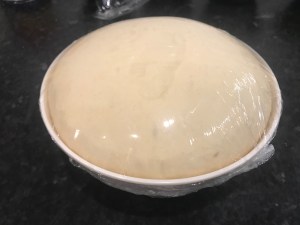 Spread the margarine on top of the dough and fold the dough on top of itself and continue to knead the dough, incorporating the margarine evenly, adding more flour if the dough becomes sloppy and the margarine isn’t incorporating. The dough has been kneaded enough when you shape the dough into a ball and you press a lightly floured finger in and it springs back. Place the dough in a lightly greased bowl and cover with clingfilm and leave to prove until doubled in size.