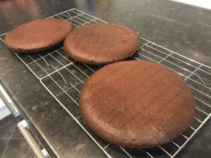 Divide the cake batter equally between the three cake tins and bake the sponges for about 15 minutes until the sponges spring back when touched. After 10 minutes, run a knife around the edge of the cake and invert the sponges onto a cooling rack to cool completely.