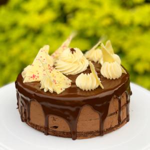 Place a sheet of baking parchment larger than your cake underneath a cooling rack. Transfer the layer cake onto the cooling rack over the parchment. If the set aside ganache cannot be poured and spread easily, place into the microwave for a few seconds until it has a pouring and spreading consistency. Pour the ganache onto the top of the cake and use the back of a spoon to spread out the ganache over the edges so that it drips down the side slightly. Return the cake to the fridge to set briefly.