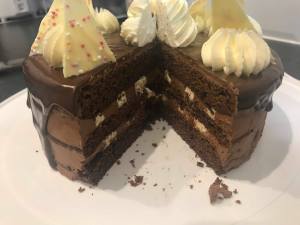 You will notice that this cake recipe has no sugar in it. This was an accident during the recipe testing but I didn’t want to throw away the cakes so I carried on and it turned out to work really well with the rich ganache and the sweeter white chocolate raspberry cream. Of course the chocolate has sweetness however it’s interesting how the absence of 250g of sugar was not noticeable in the final cake. I think it’s quite nice to have a chocolate cake recipe that isn’t sickly sweet.