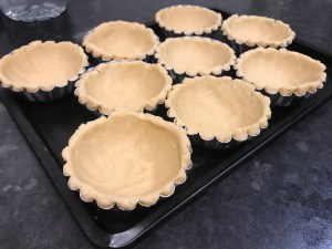 Weigh out the pastry and divide the pastry into 9 equal pieces, rolling into balls. Press each ball into 9 6cm individual tart tins, using your thumb to work the pastry up the tin, rotating the tin as you press the pastry in. Make sure that the pastry fits the tart tin well. Repeat for all the pastry cases and then place the tart tins into the freezer for 20 minutes.