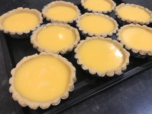 Pour the egg custard mixture into the tart tins about 80% full. Carefully transfer the tray into the oven and bake the egg tarts for around 25 minutes. When the pastry has turned golden at the top, turn down the temperature to 160˚C and continue to bake the tarts until the very centre of the tarts wobble when you shake the tray.