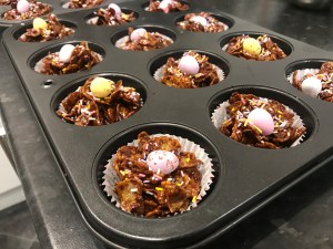 Spoon the cornflake mixture evenly between the paper cases. Top each cake with some sprinkles and a Mini Egg in the centre and place into the fridge to chill for at least 2 hours or overnight to set.