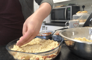 I like my crumble topping to have oats, it’s always been a thing that we do in our family. Sometimes if we have nuts too, we crush them up and add them to the crumble so they toast as the crumble bakes and become aromatic. I always add demerara sugar though, which adds a crunchy texture and a light caramel flavour.