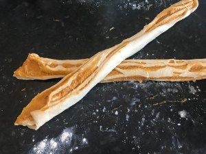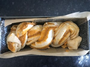 Place the two pieces of dough cut side upwards in a cross and braid the dough by alternating the pieces. Tuck the edges together and carefully lift the shaped babka into a 25cm loaf tin which has been well greased and lined with a strip of baking parchment along the long edges which hangs over the edge, squashing the dough slightly to make the babka fit in the loaf pan. Cover the babka with clingfilm and leave to prove for about 45 minutes or until the babka has risen.