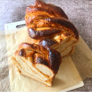 Babkas are an incredibly popular bake made from a yeasted dough and a filling. The babka is finished with a drizzle of syrup after it comes out of the oven which gives it a sticky glazed effect as well as making the bread even softer and moist. The trademark of a babka is how it is shaped; the dough is rolled up with the filling and cut down the middle lengthways to give two portions of dough which are braided together and baked in a loaf tin. It is this shaping process that is a hard process for this particular recipe as the sweet potato filling has a tendency to leak out when you braid the dough and the dough is really soft too, which is because I use the tangzhong method for my dough.