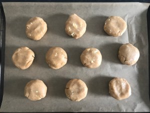 Weigh out 60g portions of the dough. Shape each one into a ball in your hands and flatten out a space to put a square of white chocolate. Reshape the cookie dough to cover the white chocolate and place onto the baking tray, flattening slightly. Repeat with the remaining dough and chocolate.
