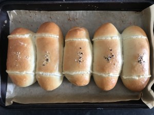 Preheat the oven to 180˚C. When the buns have proved, brush the surfaces of the buns with milk. Pipe two lines of the cookie dough on each bun (see photo) and sprinkle a small number of sesame seeds between the cookie dough lines. Bake the buns for around 18 to 20 minutes until the buns are golden brown and still soft. Leave the buns to cool down for about 20 minutes before moving to a cooling rack to cool fully. To eat the buns, tear them off and enjoy them warm. Store the buns in an airtight container where they will keep for about 3 – 4 days.