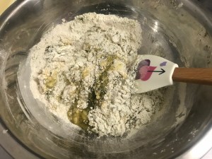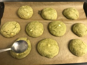 In a large bowl, combine the two flours with the matcha powder and make a well in the centre. Pour in the wet ingredients and using a rubber spatula, fold the cookie dough together. Just before all of the flour has been incorporated, mix through the chopped white chocolate chunks. The dough should come together easily.