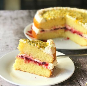 This recipe is a luxurious and upgraded version of the classic Victoria Sandwich. The addition of ground almonds and almond extract in the sponge gives it a fantastic flavour and I love the combination of the sweet slightly tart passionfruit topping with the raspberry jam and the light almond flavour in the sponge. I always associate passionfruit with being a bit fancy and the topping does really take this cake up to the next level!