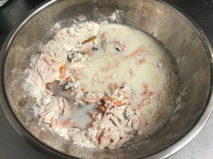 Kate’s recipe also uses buttermilk, an ingredient traditionally used in soda bread making. The acidic buttermilk reacts with the alkaline bicarbonate of soda, producing air bubbles that help the bread to rise. It is important to work quite quickly as the reaction happens as soon as the bicarbonate of soda comes into contact with the buttermilk. If you don’t have buttermilk, you can replace this either with a combination of natural yoghurt mixed with milk or you can make a replacement by mixing milk with some lemon juice, the option that I usually go for.
