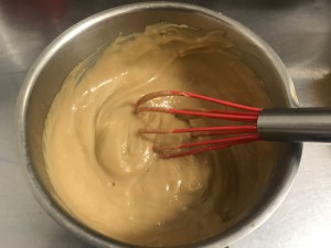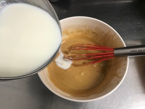 Pastry cream is made by mixing together egg yolks (with sometimes whole eggs, like in my recipe), sugar (in this case, dark brown sugar) with a starch (here it is cornflour and plain flour) until it forms a thick batter. Warm milk is gradually whisked in to prevent the eggs from scrambling (a process called tempering the eggs) before returning to the heat to cook out the starch to form a thick but delicious custard.