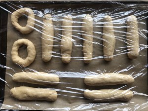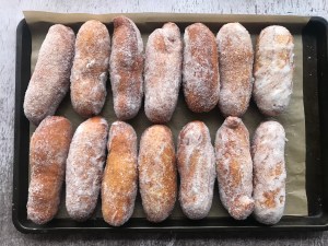 When the dough has proved, turn the dough out onto a lightly floured surface and knead for 1 minute to knock back the dough. Divide the dough into 70g portions; any leftover dough can be made into ring doughnuts or small doughnut holes. Shape each 70g portion of dough into a 15cm finger shape with rounded ends, making sure that the doughnut is even width throughout. Place the shaped doughnuts onto a lined baking tray and cover with clingfilm and leave to prove for about 30 minutes.