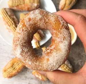 The doughnuts should remain submerged in the oil for a few seconds before rising to the surface. Cook the doughnuts for about 3 minutes on the first side or until it turns golden brown and then carefully flipping over to cook the other side.