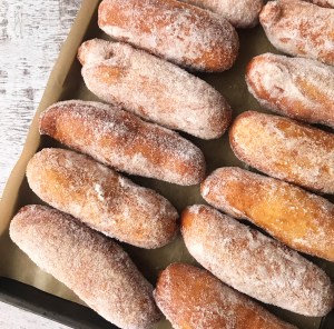 When the colour of the doughnuts are even, remove them from the oil and drain the excess oil. Place the hot doughnuts into the bowl of sugar and toss the doughnut to coat completely in sugar. Avoid touching the doughnuts too much while coating and then move to a wire rack to cool down completely.