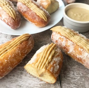 To fill the doughnuts, whip the chilled pastry cream until it is smooth again and place into a piping bag fitted with a star tip. Slice the doughnuts down the middle using a serrated knife, slicing far enough down so that the filling can get down to near the base, making sure you don’t slice through. Hold open the doughnut and pipe a decent amount of the pastry cream along the middle of the doughnut.