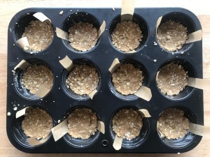 In a mixing bowl, cream the margarine until it is softened. Add in the light muscovado sugar, creaming well with the margarine until thoroughly combined. Add in all of the dry ingredients and using a spatula, fold the dry ingredients in until the mixture forms a soft but crumbly mixture that holds together when squeezed together. Divide the mixture between the holes of the muffin tin and press the mixture into the bottom of each hole. Bake the bases for 10 minutes, remove from the oven to cool down and turn down the oven to 150˚C.