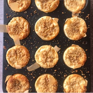 Spoon the cheesecake mixture evenly on top of the apples, shaking the tin to level out the mixture, ensuring that the mixture doesn’t come all the way to the top. Lightly sprinkle over the crumble mix on top of the cheesecake. Bake the cheesecakes for 25 minutes, or until the tops of the cheesecake are lightly golden brown at the edges and when you shake the tin, the very centre of the cheesecake has a slight wobble.
