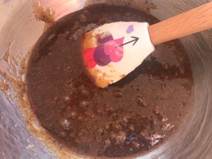 Gradually pour the melted margarine, still warm, over the two sugars in a mixing bowl and whisk until the sugar has absorbed the margarine. Whisk in the maple syrup, the egg and vanilla extract until the batter is evenly mixed.